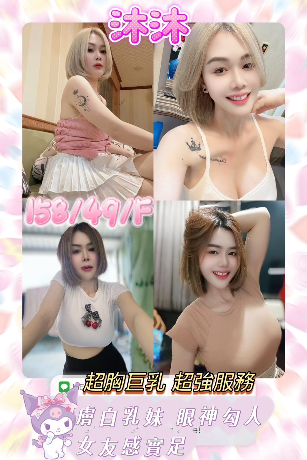無套吹 深喉嚨 共浴 親嘴 舌吻 品鮑 69 舔蛋 奶泡 水中蕭 胸推 屁推 按摩 可配合絲襪 可配合情趣用品