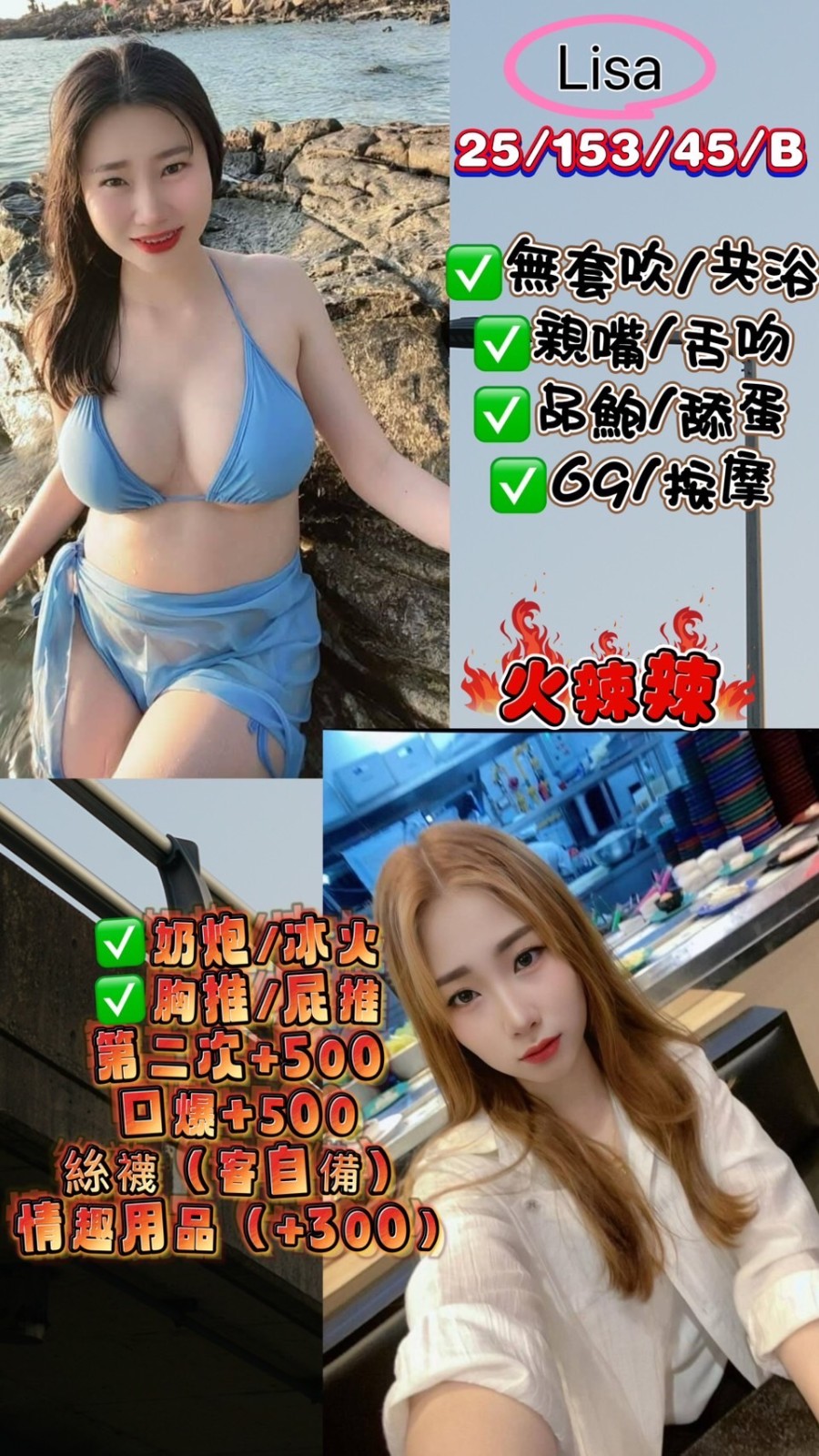 無套吹/共浴/親嘴/舌吻/品鮑/69/舔蛋/奶炮/水中蕭/胸推/屁推/按摩/絲襪(客自備)/情趣用品(+300)玩具客人要自備
