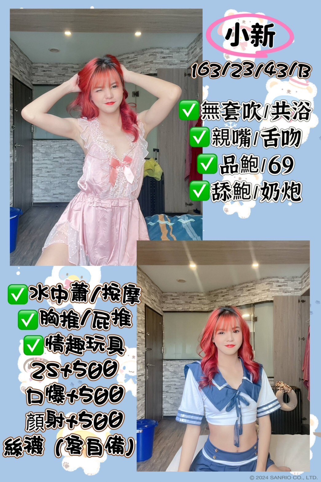 無套吹/按摩/甜蜜共浴/冰火/舔蛋/舌吻/胸推/屁推/奶炮/品鮑/69/露珠客+500/口爆+500/絲襪+100/情趣用(+500)