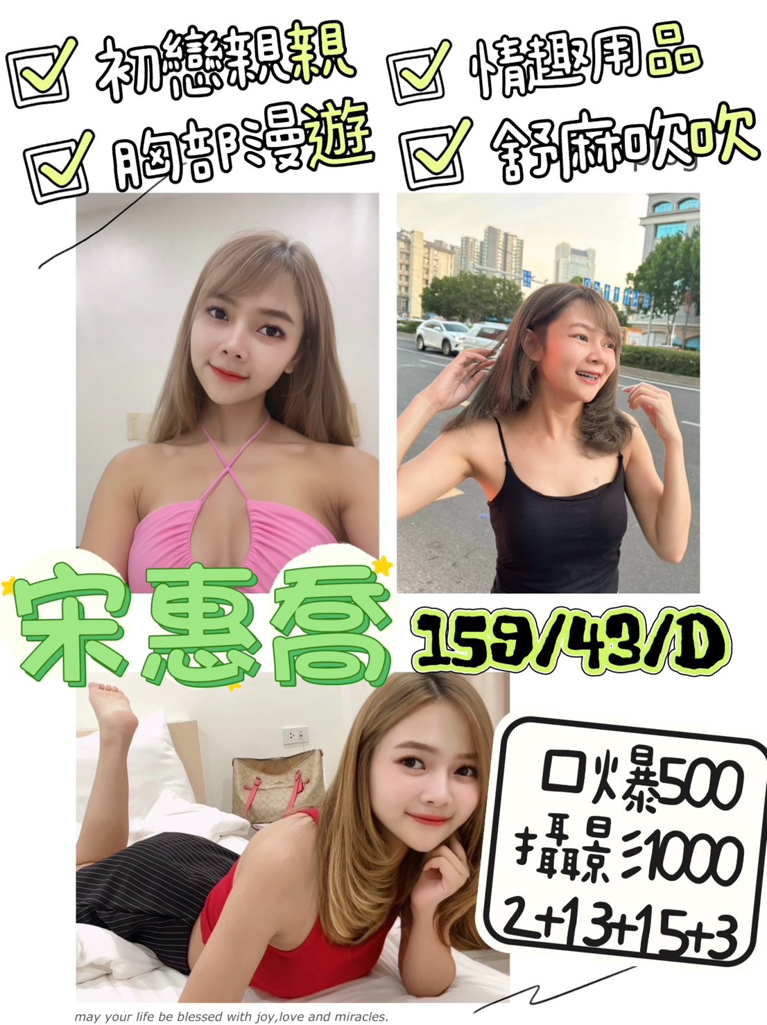 紓壓按摩 / 胸磨臉 / 女友式調情 / 絲襪誘惑 / 雪乳胸推/ 蜜桃屁推 / 酥麻舔蛋 / 無模口吹