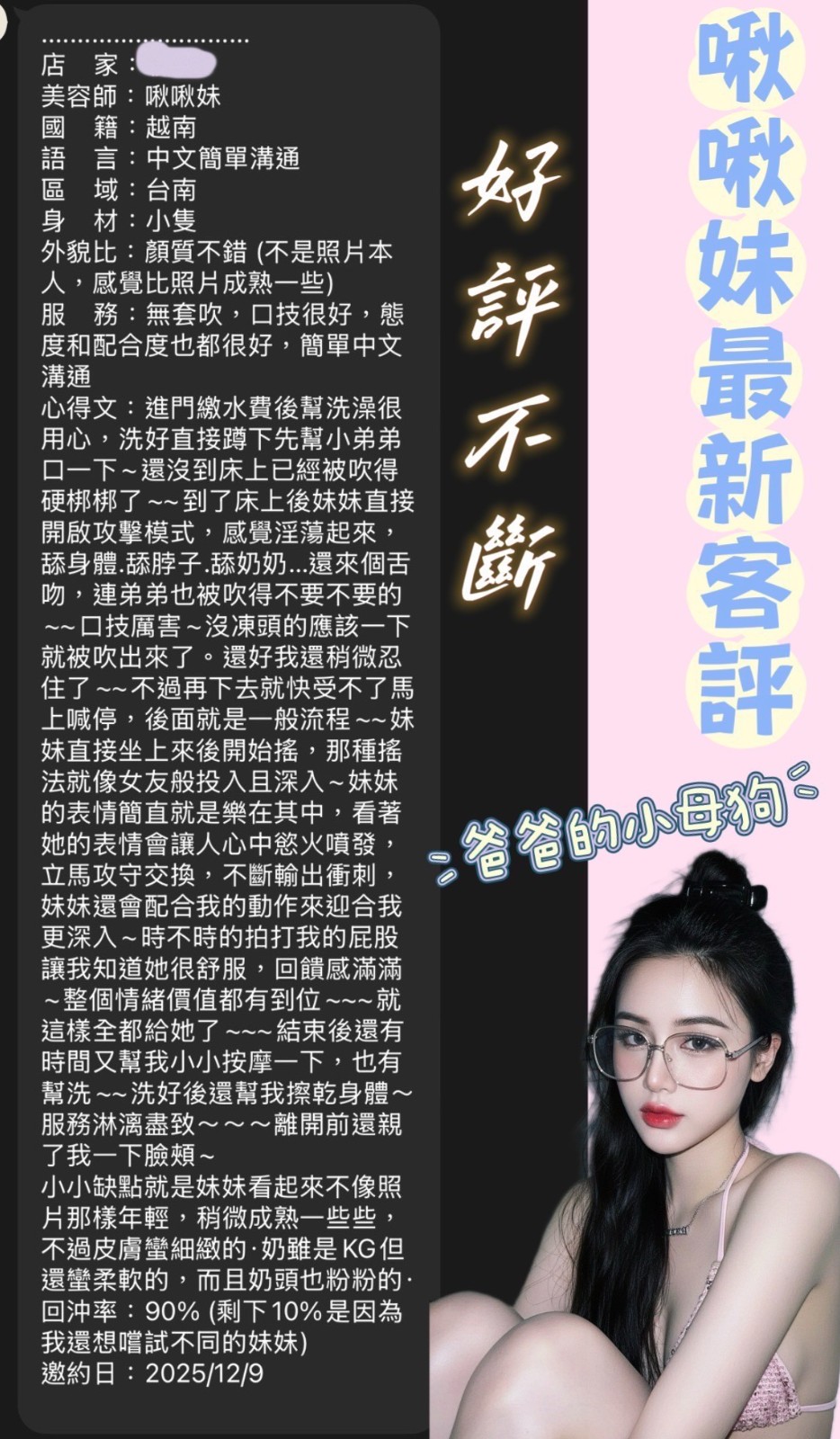 服務項目:共浴/無套吹/舌吻(視口腔清潔)/小親親/按摩/乳交/足交/舔蛋/品鮑/69/角色扮演(性感內衣)…